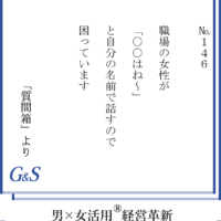 №146<質問> 職場の女性が「○○はね~」と自分の名前で話すので困っています。 プライベートな場ならともかく・・・ <アドバイス> 男性で、「○○はね...